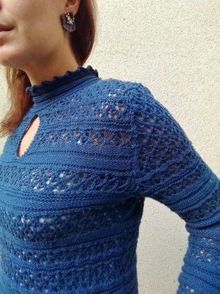 This fitted sweater has an interesting texture. I wanted something that could be worn in different ways, and in different seasons. It can be worn with a tank top underneath or, for the bold among us, with just a bra. Made out of a cotton and linen mix, it’s ideal for warmer days, but can easily be worn during the colder month by simply wearing a long sleeved t-shirt underneath. It can also be worn in two ways, with the keyhole in front, or in the back. Instructions are also provided in case you want to knit the body of the sweater a little longer.