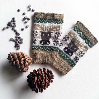 This is a pattern for a pair of stranded mitts with a friendly moose. Chocolate Moose mitts are worked from the bottom up and in the round and with 3 strands of lace weight yarn held together.