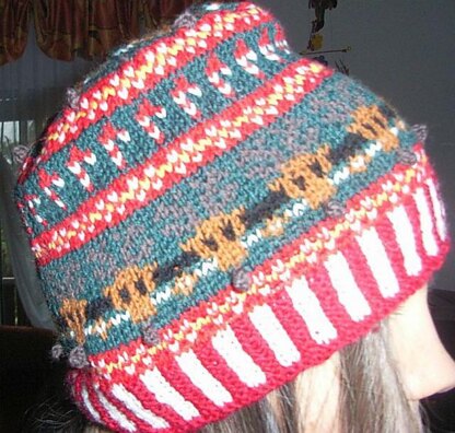 This cute beanie has reindeers and candy canes all around. Seven reindeers and a red star are at the top. The reindeers have a noop as a nose. So they are 3-dimensional!