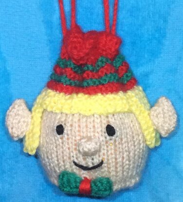 This knitting pattern is for a festive drawstring gift bag in the shape of an elf's face.
