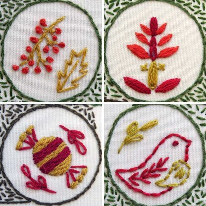 Beautiful, Colourful and Fun Hand Embroidery Designs Discover your next stitch journey.\n\nHere at Stitchdoodles we are all about creativity. Sitchdoodles was created in 2019 after I was finding it difficult to find hand embroidery patterns that were exciting and a bit different from the usual. Wanting to combine our love of hand embroidery stitches, traditional sampler techniques as well as quilt designs(!) I decided to come up with something myself and it has evolved into an array of wonderful and colourful designs that will hopefully inspire and excite people to pick up a needle and get 'happy stitching’.\n\nWhat you will receive:\n• This pattern is available as a PDF download so you can access the pattern as soon as you would like.\n• Each pattern comes with details on the colors, threads, and materials required.\n• Easy to follow instructions are given along with full-color photos.\n• All templates are provided actual size.\n\nThis is the fantastic Advent Calendar design we stitched for Christmas 2022 and it is now available as a full pattern so everyone can stitch a beauitful tree filled with folk decorations.\n\nThis design is suitable for beginners as well as the more advanced stitcher to create a fun stitched piece to make your home look special during the Christmas period.\n\nYou could also stitch the individual items on tree decorations, jumpers, napkins to name a few - make Christmas extra special with a personal touch.\nFinished size approx. 7.5 x 10 inches round.\n