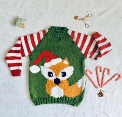Fox has his Christmas hat on and the sleeves are candy cane stripes.