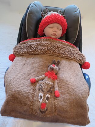 Knitting pattern contains the Christmas Reindeer Car Seat Blanket. Includes blanket, hat and Reindeer toy.