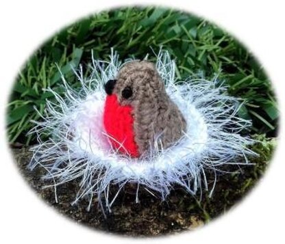 Both Robin and nest are knitted in easy, complete pieces, using straight needles and leftover oddments of DK yarn / Tinsel yarn.