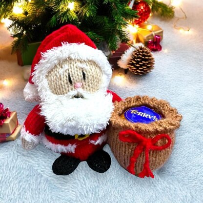 This gorgeous Christmas Santa with Sack pot knitting pattern is made to hold chocolate goodies. I have put small sweets in the pot but any similar sweet or sweets could be used. It also fits a Terry’s chocolate orange. This makes a stunning addition to your table, a fantastic fund raising item for fayres etc or great as a novelty decoration.