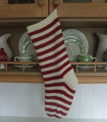 A simple stocking in Christmassy cream and red that knits up quickly to hold all those little presents. Make it plain if you prefer.