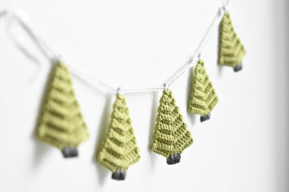 Christmas tree garland pattern includes crochet instructions with 3 different ideas of assembling. The garland can be used as a decoration on walls, shelves etc. The tree motif can be used separately as a tree ornament or in gift wrapping. Let your imagination guide you!