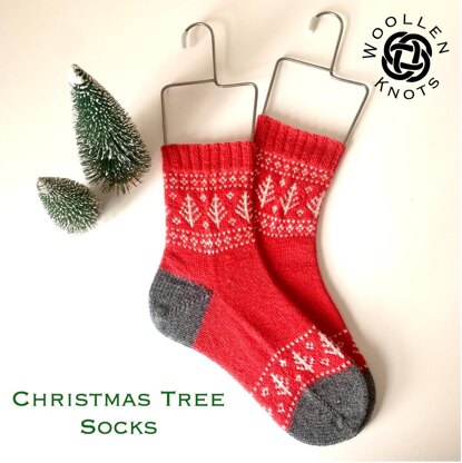 The Christmas Tree Socks are knit from the toe up with colourwork on the foot and leg, and plain stocking stitch in between.
