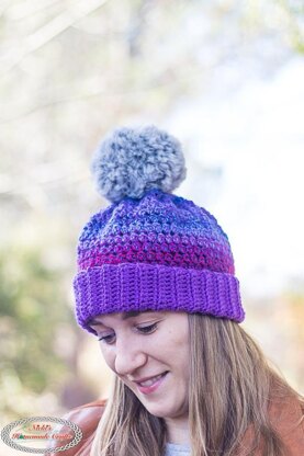 This cute Chroma Hat has a fold-over brim and faux fur pom pom. The hat can be made in any size. Video tutorial is provided as well - for both the hat and the pom-pom.