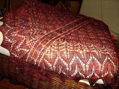 Full sized shawl features a wavy pattern reminiscent of Chrysanthemum flowers, divided by panels of wine glass lace, and edged in an open section that mimics the rounded lines of the waves and segues into a larger leafy pattern with ribbed points.