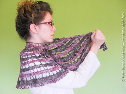 Crochet allows a lot of fabric creativity that knitting lacks. This shawl takes advantage of an exponential growth within sections to form a wavy/flowing fabric and shape that lays flat when required but drapes, jellyfish-like, around your body when worn.
