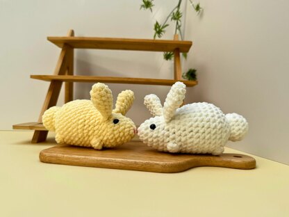 Make the cutest round bunny plushie with chunky yarn and zero sewing. This little rabbit has a bobble-stitch textured body, upright ears with pink inner details, tiny paws, and a fluffy stubby tail. The pattern includes two color variations (white and pale yellow) so you can make a whole bunny family.