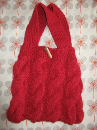 This is a pattern for a chunky cables bag, originally published in Knit Today. It has a simple cable, and is shaped in towards the top of the bag. The top and handles are in moss stitch, with a toggle fastening. Width at the bottom 30 cm.