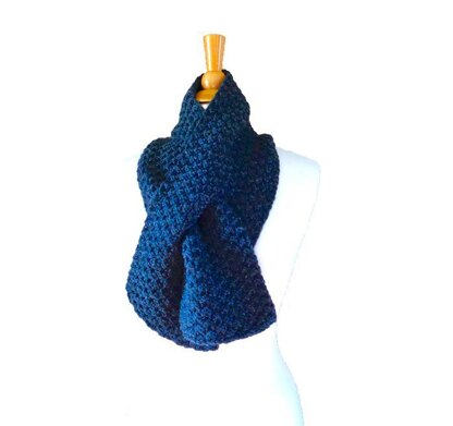 A thick and warm keyhole scarf with a box stitch pattern for interest, with two strands of a sport weight yarn for a thick, squishy fabric.