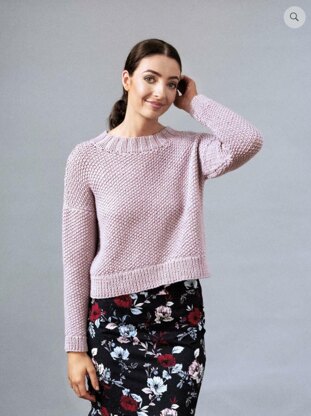 A comfortable casual loose knit sweater with drop shoulder shaping and extra room. Worked in Moss stitch throughout using two strands of yarn together. Rib bands use single strand of yarn.