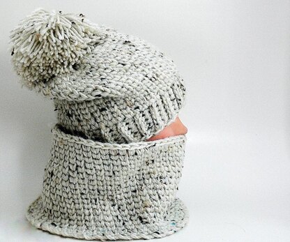 Crochet Pattern for a Knit Look Chunky Slouchy Hat and Cowl. Super Easy! Does not look crochet at all. Looks like it is completely knitted. Works up very fast. Sizes range from Toddler, all the way up to Men's X Large.