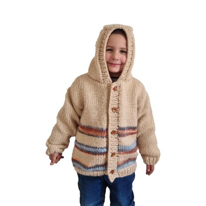The Chunky Striped Hooded Cardigan is a cozy, quick knit cardigan featuring stripes on the body and a soft, neutral hood and sleeves.