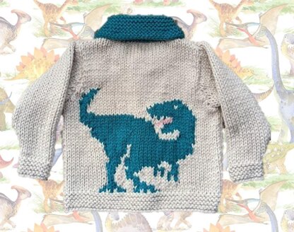 Knitting pattern for children aged 1 to 11 years. Knitted in Chunky (12 ply) Yarn so grows very quickly. Large, coloured intarsia charts to follow for the small T-Rex on the front and large T-Rex on the back.