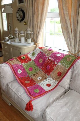 Wrap yourself in this colourful cozy chunky throw or use it to accessorize your home. Using chunky yarn and 6.00mm/7.00mm hooks. Crocheted popcorn flower squares are joined as you go. A border of double crochet is worked around the throw to frame it. Tassels are then attached to complete it.