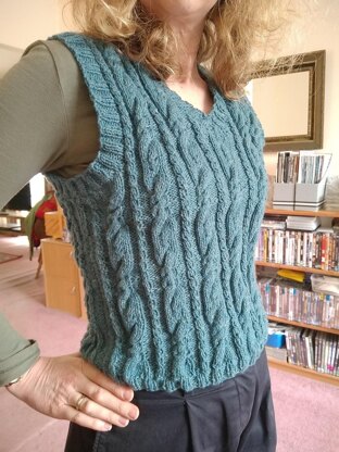 A fitted, cable and twist stitch, hip bone length vest with a V neck and some shaping from waist to bust, in pure merino.