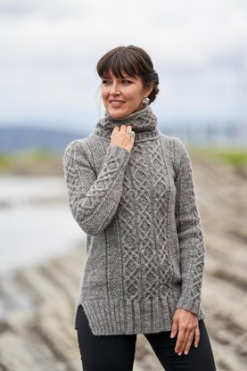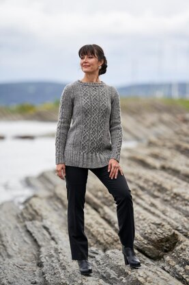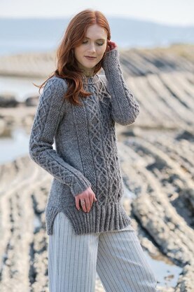 Named Cian after the Irish God who rules over love magic, is this long A-line pullover. Three central Moss cables, framed by double seed stitch, adorn the center of the body which ends in a vent. Cian is crowned with an I-cord decoration around its crew neck. Wear the matching Cian Cowl as a loose collar. The sweater is knit in pieces from bottom up while the cowl sideways, both in the divine Hillesvåg Ullvarefabrikk, Tinde Pelsull.