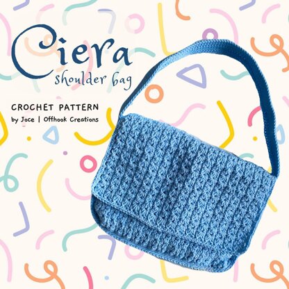 Ciera is a shoulder bag crochet pattern that features a flap closure. The bag is made with 2 rectangular panels that are sewn together with a long strip that functions as both the bag base, sides and strap.