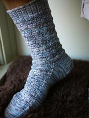 A top-down unisex sock in four sizes, with a robust knit/purl block-work pattern leading down the leg and over the top of the foot. Motif is reversible for toe-up construction. Substituting needles and/or yarn may result in an overall variation in size.