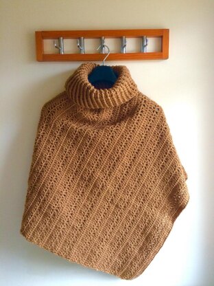 The pattern is for a poncho that fits most sizes, it is 92 cm at the widest point and 80 cm from neckline to the lowest point. It has a modern oversized collar that will keep you warm and cosy.