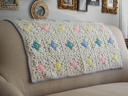 This simple motif is easily customized, making it a great go-to pattern. This version includes pastel circles against white for a colorful baby blanket. The pattern also includes a join-as-you-go tutorial. Say goodbye to seaming with this technique!