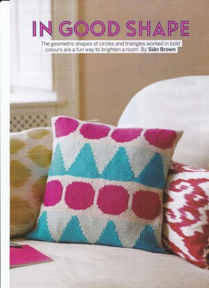 This is a pattern for Circles and Triangles Cushion Cover, originally published in Simply Knitting. It has a plain back, intarsia front with circles and triangles. Moss stitch edges and buttonholes to fasten. Main photo Simply Knitting.