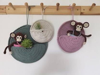 These circular hanging baskets are quick to make with macrame cord and are whimsical containers that will serve as a lovely home décor project! They are crocheted around a metal ring that can be hung up on a knob or a hook. Inside the basket, you can place your cute amigurumi dolls, potted succulent plants, keys or other trinkets! This pattern includes 3 sizes, a small, middle and large version so you can make a nice collection of varying sizes. These baskets make great housewarming gifts.