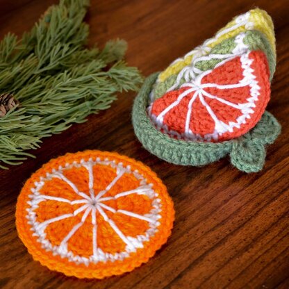 This crochet pattern includes the steps to create 4 coasters and 1 leafy bowl to store the citrus fruit slice coasters.