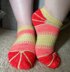 Sock begins at the side of the toe with a crochet provisional cast on. Toe is worked flat using short rows, then stitches are picked up from the provisional cast on and the edges of work. Sock then proceeds upward in the round. The short row heel has extra height to raise the back of the heel before finishing with a brief cuff. Sample socks are size 3. Yarn used in sample socks is Less Traveled Yarn, 757 Sock Minis. Orange socks are A/Gossip Column, B/Desert Marigold, C/Spicy Salmon, D/Halston. Green socks are A/Saguaro, B/Desert Marigold, C/Cactus Flower, D/Barley