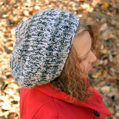 The bulky slouchy hat is worked in the round. Skills needed are working a knit, purl, Kf/b, and P2tog.