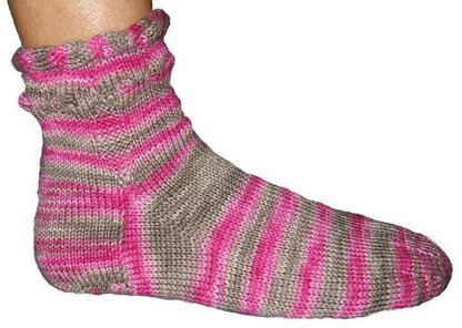 This pattern features a topping of east-west cables over a bobbled area which, at closer look, is actually a portion of a ring of voluptuous torsos celebrating the female form (hence the name “Cleavage"). I designed this sock for National Breast Cancer Awareness Month (October). This unusual sock is further enhanced by using a wonderful new colorway from Chameleon Colorworks called “Support the Girls" (my business partner, Becky Curran, came up with the colorway name at our knitting shop, The Yarn Deli, over knitting, lively conversation, good laughs, and cups of tea!). Nancy Colburn, a friend of mine and owner/dyer of Chameleon Colorworks, donates a portion of the sale of each skein of her “Support the Girls" colorway toward breast cancer research. “Cleavage" sports a subtle star toe and an easy stockinette heel.