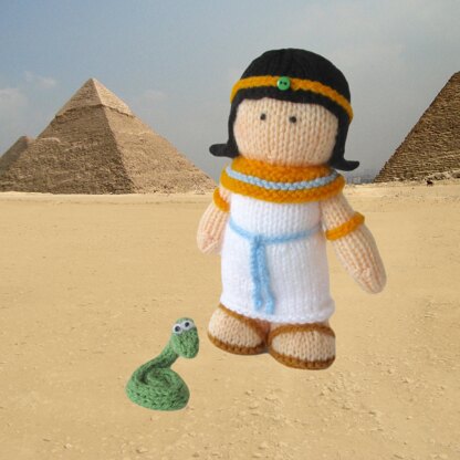 Knit a Cleopatra doll for Egyptologists or fans of Liz Taylor. Cleo also has a little knitted asp snake for a Shakespearian ending! This pattern incorporates a 3 needle join to join the skirt to the body as you knit. Designed by Amanda Berry @fluffandfuzz, these toys are knitted in acrylic DK yarns. Most pieces are worked flat (back and forth) on single pointed knitting needles, not in the round. The headdress, bangles and belt are single crochet chains worked on the crochet hook, and the snake is i-cord worked on the two DPNs. For confident beginners and above, other techniques used include casting on and off, knits, purls, increases and decreases, and seaming to finish.