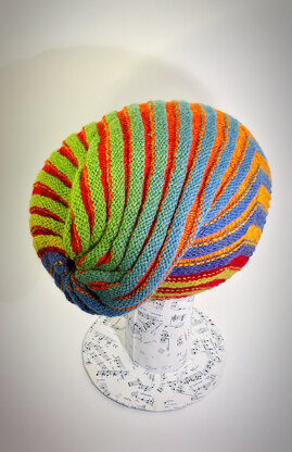 This is a sassy, bouncy, spiral hat knit flat on the bias and kitchener stitched together. It is totally reversible, and I recommend knitting it in long gradient yarns, pulling from either end of the same ball or using contrasting gradients. It is worked in small, 20-row sections and is therefore customizable to any size. And there are only four ends to weave in!