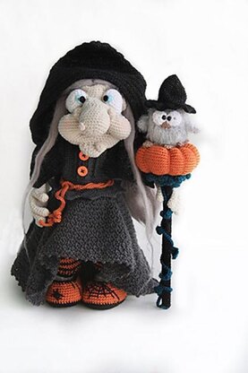 Today I am going to tell you how to crochet a beautiful clothes for our good witch and her best friend - owl. Note that the clothes and owl are crocheted with a hook. The tutorial consists of 46 pages and includes over 125 photos and charts. Clothes are crocheted for a doll about 15.7 inches/40 cm tall, so it is very important to observe the recommended options of the yarn. A beautiful set of clothes reminds lightness and magic. It consists of 5 items of clothing: a dress with a fluffy, airy skirt with a train, witch's shoes with a spider and spider's web, a belt, striped pants, and a magically shiny cape with a hood. Make a magic stick with a pumpkin on the top to complete the full image of the toy.
