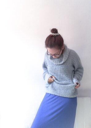 The sweater is worked in simple stitches with a large ribbed roll neck and long cuffs you can roll back or leave long.
