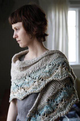 Pluck down puffy clouds and snuggle in: this super bulky shawl will make you feel like you’re floating on air. It knits up quickly, with a Stockinette body shaped with short rows and graced with a wide lace border. Use one color, or knit the border in a contrasting gradient for a gorgeous look — Spincycle Yarns’ amazing multi-colored Knit Fast, Die Young is a fantastic choice!