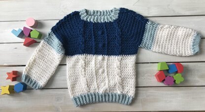 This is a jumper for young children which references traditional Aran knitwear. These are off-white jumpers with cables on the body and sleeves (said to be specific to each family on the islands). The twist here is that there is some colour blocking. It is a cosy winter make for girls or boys and would make a great heirloom piece to be handed down to young siblings, cousins or friends.