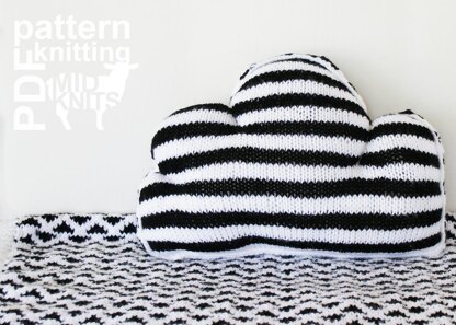Knit your own 11"x16" black and white Cloud Pillow. This pattern uses stockinette stitch and easy color changes to create fun and modern repeating cloudy stripes. Knit with #4 worsted weight acrylic yarn, this pillow is durable and easily washable. These written instructions include a colorwork chart, making it an easy to follow how-to.