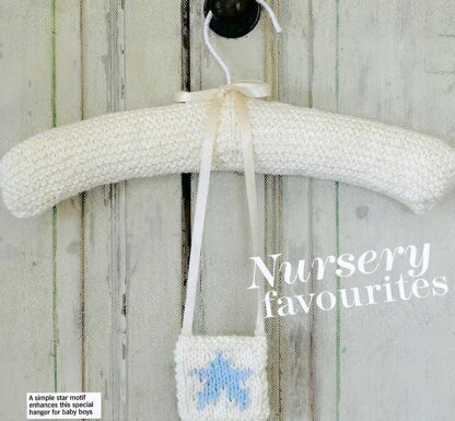 This is a pattern for two coat hanger covers, originally published in Knit Today. The pink version is in stocking stitch with a lace border, the blue in stocking stitch with an intarsia star motif attached to the hanger. Photos Knit Today.
