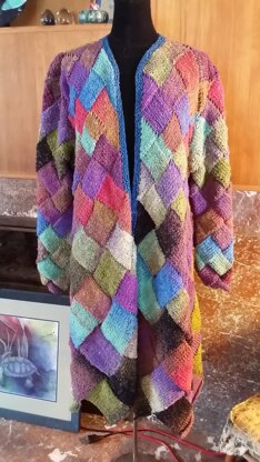 This beautiful flowing coat is knit using a single ply aran weight blend of silk and cotton from NORO called Taiyo. It is knit in the Entrelac stitch pattern making a bias construction that gives a wonderful forgiving fit. The pattern explains the stitch and gives You-tube references to help the early entrelac knitter. The size of the project actually seems to knit fast because of the color changing aspect of the yarn and the excitement of how the pattern progresses. Each shape is detailed line by line and then grouped as a "tier" for easy understanding. Graphics are included with a schematic and stitch counts for each size to mark up for easy reference. Shapes are repeated throughout the pattern as you learn each one.