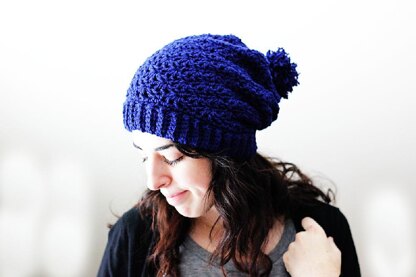 Crochet a slouchy pompom beanie with this easy pattern! You'll work the brim first, and then complete a bottom-up construction of the crown.
