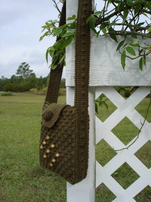 Quick, easy, and fun to make, this shoulder bag has a pretty cobblestone pattern created by a ball stitch. The shoulder strap has the same ball stitch design and extends to form the sides and bottom of the bag. The model shown here features the optional nine beads on the front panel. The button is crocheted, stuffed with polyester fiberfill, and sewn onto the front of the bag.