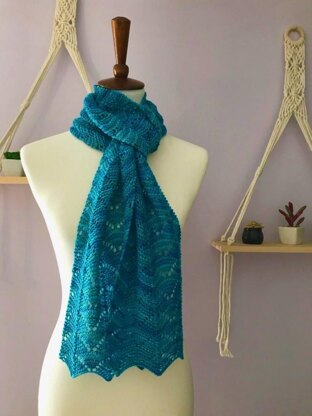 Cockleshell is a delicate and easy to knit scarf. Knitting the scarf in two identical pieces, and then seaming them together with a three-needle bind-off, allows the scalloped bottom edges to match perfectly. Suitable for the adventurous beginner and beyond.