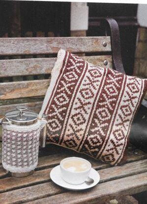 Fair Isle cushion cover in coffee and cream colours, originally published in Knitting magazine. Fair Isle front, stocking stitch back, moss stitch edges with buttons. Photos Knitting magazine.