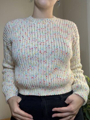 The Cold Weather Sweater is a cropped, boxy knit-like crochet sweater with fitted sleeves that mimics the classic ribbed fisherman's sweater. The body panels are made working sideways rather than the bottom up, and then the sleeves are directly seamed on. The bottom ribbing of the sleeve and body panels are worked in the same rows of the main stitch.