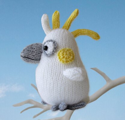 Colin is a cuddly cockatoo bird. Knitted predominantly in stockinette and with garter stitch eyes and cheeks. Designed by Amanda Berry @fluffandfuzz, the cockatoo is knitted in acrylic DK yarns. Most pieces are worked flat (back and forth) on single pointed knitting needles, not in the round. The toes are i-cord tubes worked on the two DPNs. For confident beginners and above, other techniques used include casting on and off, knits, purls, increases and decreases, and seaming to finish.